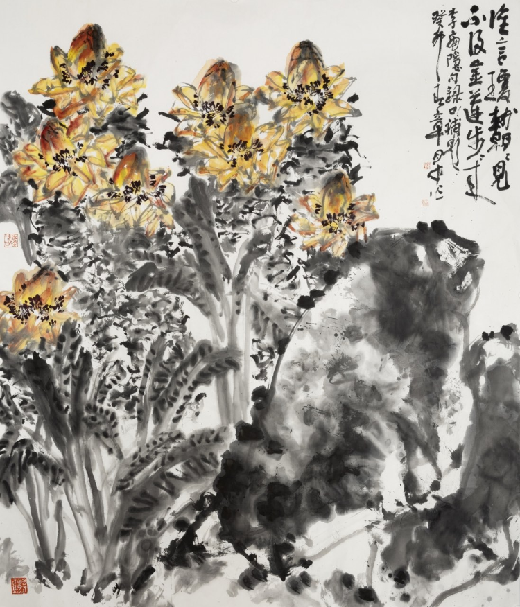 一是全景構(gòu)圖,氣象一新。傳統(tǒng)的花鳥畫總體上說構(gòu)圖比較清逸,折枝的多,賞心只有兩三枝,有時給人情調(diào)荒寒的感覺,如備受推崇的八大山人的作品,雖然經(jīng)常引人沉思、給人感悟,但也經(jīng)常讓人感到孤高冷逸,有與世隔絕的味道,乃至于讓觀賞者沉浸在凄涼悲傷中(如孤鳥白眼單腿)。這樣說,并不是說傳統(tǒng)的構(gòu)圖不好,而是說時代不同了,不能只用傳統(tǒng)的構(gòu)圖形式。時代在變,構(gòu)圖形式也在變。而章月中的花鳥畫,構(gòu)圖形式在吸收傳統(tǒng)的基礎(chǔ)上呈現(xiàn)全景式、團(tuán)塊式。一眼看去上下左右四面八方豐盈飽滿,花花草草成團(tuán)成簇?zé)崃冶挤?。花花草草在他的筆下,茁壯茂盛,生長的頂天立地,朝氣蓬勃。遠(yuǎn)觀賞心悅目,近看墨色淋漓,痛快!其狀、其象、其色氣象萬千。一幅《沉醉東風(fēng)》牡丹圖,大氣磅礴、色彩飽滿、明艷照人,給人以生命怒放的感覺,把觀賞者的精氣神一下子就提了起來,令人心潮澎湃。