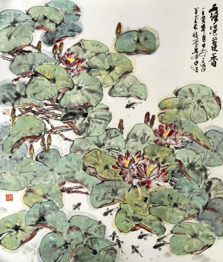 三是水色交融,渾然天成。1702年,石濤在一幅畫上題跋:“一變于水,二運(yùn)于墨,三受于蒙,水不變不醒,墨不運(yùn)不透,醒透不蒙則素,此三勝也?!彼?、墨、蒙說透了水色蒙養(yǎng)的重要性?!冻磷頄|風(fēng)》《紫藤掛云木》《田田翠葉紅蓮香》特別能體現(xiàn)他水色蒙養(yǎng)、用水用色的特點。赤橙黃綠青藍(lán)紫,他持彩練當(dāng)空舞。大膽用水,瀟灑用色,點、烘、敷、抹,蒙養(yǎng)到位,渾然一體。其水氤氳飽滿、浸染朦朧、剔透玲瓏;其色鮮艷明麗、燦爛清新、豐富喜慶。水即是色,色即是水。古人說墨分五色,實際上他的畫不止五色。因為水用得好,色就千變?nèi)f化,創(chuàng)作的作品水色迷人,遠(yuǎn)看近觀水色一天。紅花墨葉成就了大師齊白石。燃燒的《向日葵》、金黃的《麥田》成為西方印象派大師梵·高的代表作。大膽借鑒齊白石、梵·高的用色,在色彩選擇中注入主觀感受,來營造出貼合自己心境的畫面,成為章月中花鳥畫的一大特點:水色淋漓、墨彩交輝。水色帶給觀賞者的愉悅,如春日里看到的鮮花、夏日里吹到的清風(fēng)、秋日里摘到的碩果、冬日里曬到的暖陽,愜意、暢快,心生歡喜。
