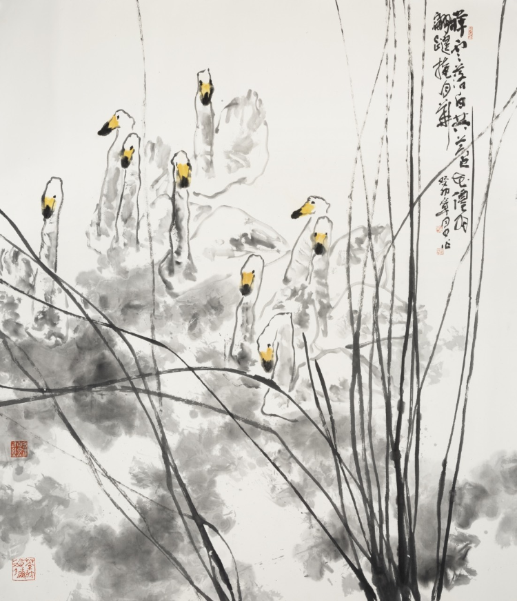 二是筆墨隨心,心有靈犀。有人曾經(jīng)說,筆墨等于零。實則不然。中國畫幾千年的歷史恰好說明,筆墨乃中國畫的核心,是中國畫的DNA。歷史上凡是名家名作,無不是筆精墨妙。筆墨乃性情之事,用筆和用墨是分不開的,筆法墨法心有靈犀一點通。章月中的筆感、墨感、筆性、墨性都很強(qiáng)。極好的筆感、墨感、筆性、墨性來自于他的興趣、勤奮、學(xué)養(yǎng)、天賦。且看《春韻》《華頂杜鵑》《綽約新妝玉有輝》《亂山窮處亦花開》《田田翠葉紅蓮香》《蘆花啼鳥》,筆法瀟灑奔放,濃淡干濕焦五色豐富,渾厚華滋,剛?cè)嵯酀?jì),自然流暢,筆斷意連,有味道,有氣韻,形式和內(nèi)涵完美融合在了一起,用石濤的話說就是“用情筆墨之中,放懷筆墨之外”。筆墨的至高境界在于思想和靈魂的體現(xiàn)?!坝芯辰鐒t自成高格”,王國維說得真對。古代許多大家的作品之所以能夠吸引人們的目光、攫取人們的靈魂,主要原因在于他們的筆墨所體現(xiàn)的美學(xué)之道、哲學(xué)思想。研讀分析感受欣賞章月中的筆墨,讓我想起了《中庸》里面的金句“致廣大而盡精微,極高明而道中庸”,“天地之道:博也,厚也,高也,明也,悠也,久也”。