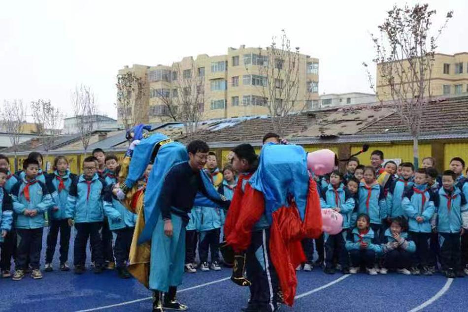 “哇,木人摔跤真是太精彩啦,我也要學(xué)習(xí)木人摔跤表演……”3月1日下午,清水縣軒轅小學(xué)操場上,木人摔跤表演贏得師生的陣陣喝彩。在該校定期開展的少年宮活動(dòng)中,緱紅斌和他的徒弟高宏正在指導(dǎo)學(xué)生進(jìn)行木人摔跤表演。只見穿著行頭的學(xué)生在兩位傳承人指導(dǎo)下,跟著音樂一會(huì)兒向前、一會(huì)兒向后、一會(huì)兒又突然來個(gè)轉(zhuǎn)身,好不熱鬧。圍觀的學(xué)生更是躍躍欲試,爭著想要一試身手。