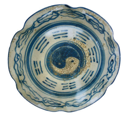 北宋蛋青釉荷葉型藍寶石礦料青花八卦太極云洗。據(jù)他回憶,是二十世紀末甘谷盤安鎮(zhèn)劉家墩的村民在取土?xí)r偶爾發(fā)現(xiàn)的。洗,是一種盛水洗筆的器皿,屬文人用品。器的口徑23cm,坐底徑8cm,高6cm。方內(nèi)畫陰陽太極八卦如意吉祥云紋圖。最醒目的是,洗內(nèi)雙龍纏繞,恍如“伏羲女媧交尾圖”的雛形。令人稱道的是,這件瓷洗,畫技大膽,內(nèi)容豐富。尤其是云、卦、太極魚三層圖景,寓意著天、地、人協(xié)調(diào)統(tǒng)一,和諧自然。其釉色歷經(jīng)千年仍十分玉潤錚亮,完美無缺,底口泥胎,胎質(zhì)黃褐色泛紅,十分精美。