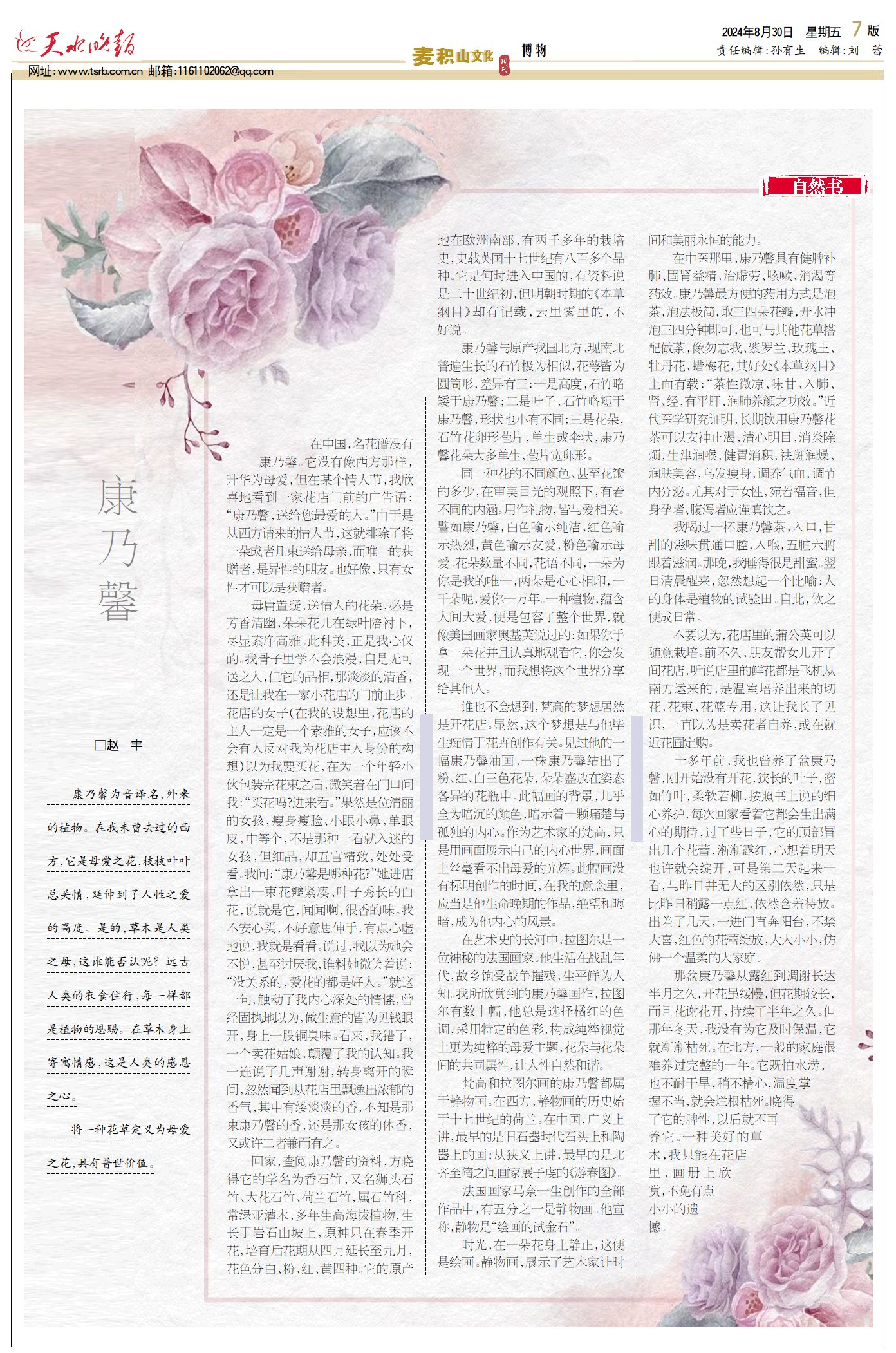 康乃馨為音譯名,外來的植物。在我未曾去過的西方,它是母愛之花,枝枝葉葉總關(guān)情,延伸到了人性之愛的高度。是的,草木是人類之母,這誰能否認呢?遠古人類的衣食住行,每一樣都是植物的恩賜。在草木身上寄寓情感,這是人類的感恩之心。
