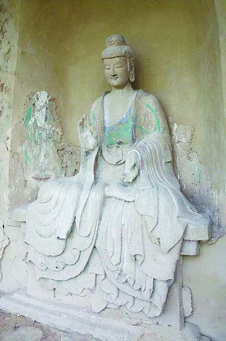 從西魏時期的長安到達(dá)麥積山需要十天之久,石窟開鑿在懸崖峭壁之上,洞窟“密如蜂房”,棧道“凌空飛架”,層層相疊形成一個宏偉壯觀的立體建筑群。在麥積山東崖下部的44窟,原為平面方形,復(fù)斗式四面坡頂,正壁開一圓拱形淺龕,現(xiàn)存造像四身,正壁龕內(nèi)主尊佛,龕外兩側(cè)各一脅侍菩薩,左壁存一弟子。該窟造像造型優(yōu)美,軀體飽滿豐潤,細(xì)膩光潔,是麥積山石窟西魏時期最有代表性的造像。