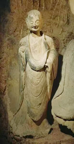 夏朗云:對,石雕還容易風(fēng)化,泥塑在麥積山石窟內(nèi)一般濕度大的環(huán)境里,千百年中風(fēng)化程度似沒有石雕大。我們看到的第44窟坐佛像的這種泥質(zhì)如新,色澤就好像不久以前那樣。但形態(tài)又不是太新,因?yàn)榻?jīng)過千余年風(fēng)霜打磨,顯得特別溫潤。如果太新的話,會感覺火氣比較大,而如今卻是超脫得不食人間煙火的那種感覺。就是說,面貌比較平和鮮活,是歷經(jīng)滄桑又脫穎而出的感覺,新和舊,古和今,形成統(tǒng)一體。所以說,坐佛像既是“生”的,意思是泥質(zhì)如新,他又是“熟”的,意思是說經(jīng)過古代風(fēng)霜的洗禮,面部有些顏料已被打磨掉了,使其露出新鮮“生”的泥質(zhì)。若顏料涂的多反而難看,就好像太濃的妝也不好。此坐佛,在千余年自然的洗禮后,有一種淡妝素抹的感覺,更加感人。其表情是秀骨清像類型中,加入豐腴女性化成分的淡妝素抹者,加之泥質(zhì)的溫潤感,且微微含笑,顯得更加溫婉可親,所以說它是麥積山石窟的一張名片。