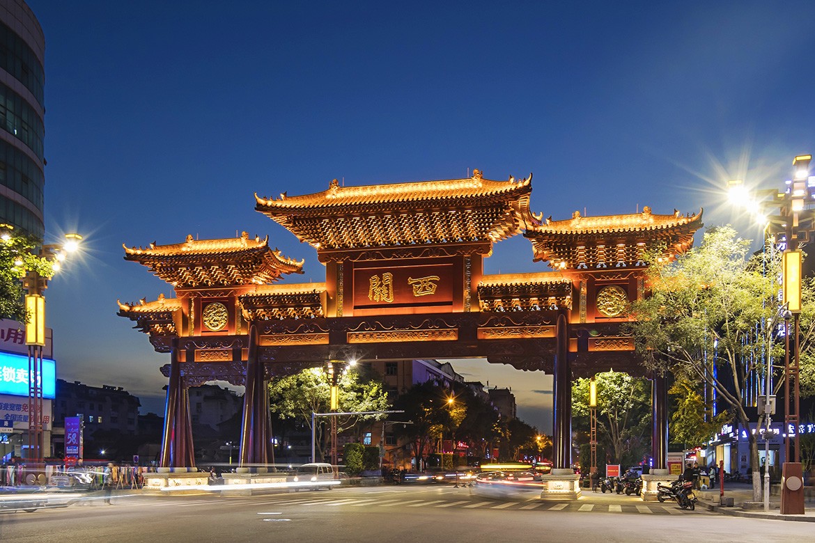 西關(guān)城呈西窄東寬的梯形,開有五門,東部通過新城門、衍渭門與中城相通,西以啟漢門與小西關(guān)相通,東北曰“大慶門”,東南曰“阜康門”。西關(guān)是歷史上商業(yè)最繁盛的地區(qū),同時(shí)也是目前古城風(fēng)貌保存較好的地區(qū)。不但擁有山陜會(huì)館、織錦臺(tái)、張育生宅、哈銳宅等眾多的文物古跡,同時(shí)大量連片古民居和街巷格局也保存完好。