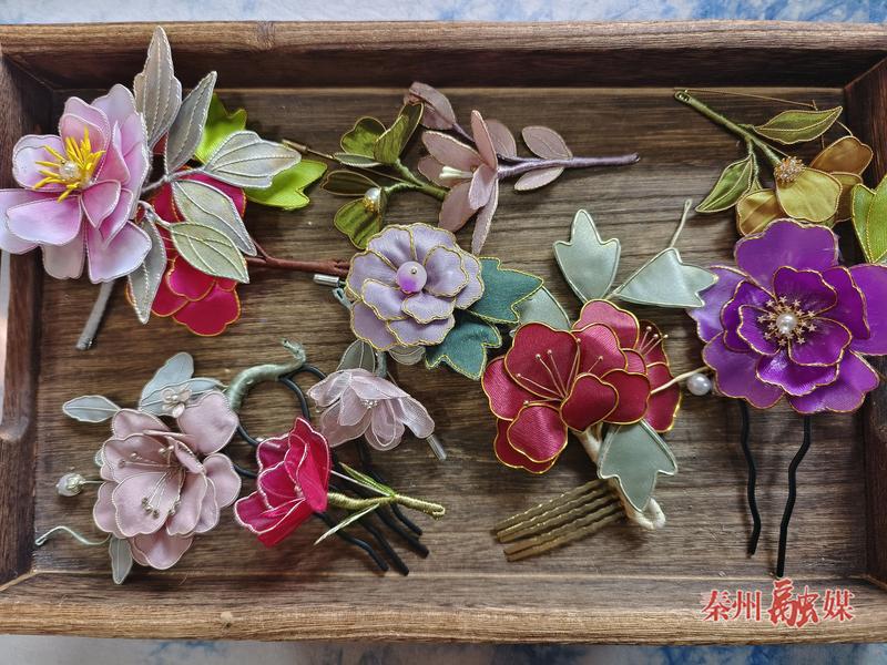“這個是掐絲的工藝,我們用銅絲掐絲好以后粘在這個面料上,做成花瓣、樹葉,最后組裝成這種玫瑰花。我們女性都是非常愛美的,我們通過觀察大自然的花朵,做出來非常漂亮的花,也展示了我們的非遺手藝?!笔屑壏沁z傳承人于穎說。
