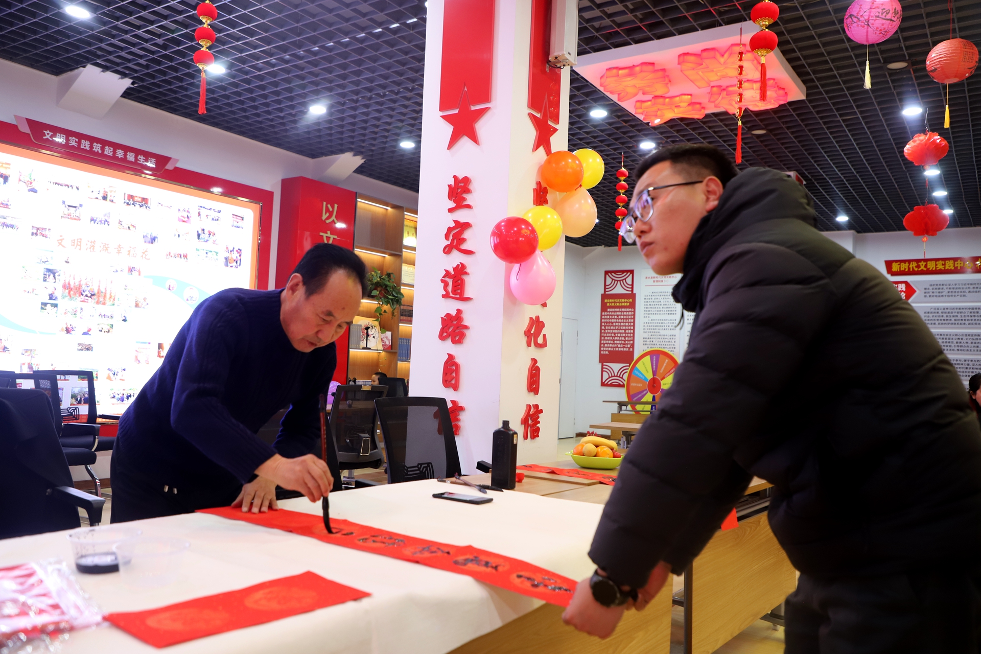 筆墨飄香送福來,紅紅火火迎新春。送春聯(lián)、送福字環(huán)節(jié)成為現(xiàn)場的一大亮點,書法愛好者們揮毫潑墨、筆走龍蛇,一副副寓意吉祥的春聯(lián),一個個飽含祝福的福字躍然紙上,將平安、健康、順利、團(tuán)圓的美好期許融入筆墨之中。