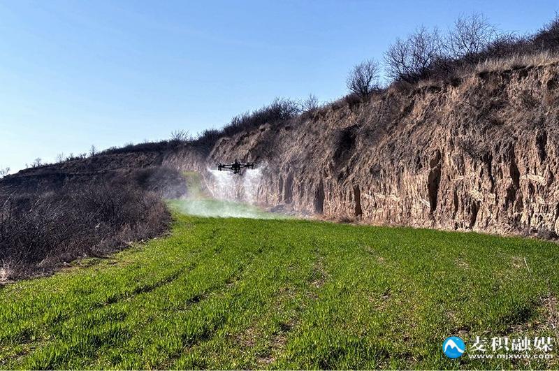 在青崖村高標準農(nóng)田,山地麥田管理盡顯“科技范兒”。植保無人機低空掠過綠油油的麥苗,按照預(yù)設(shè)航線精準噴施水肥,霧滴均勻覆蓋作物,高效完成田間管理作業(yè)。相較于傳統(tǒng)人工作業(yè),無人機作業(yè)效率提升了數(shù)十倍,能夠精準定量施肥,養(yǎng)分供給更加均衡,有效破解了淺山丘陵地區(qū)的耕作難題。
