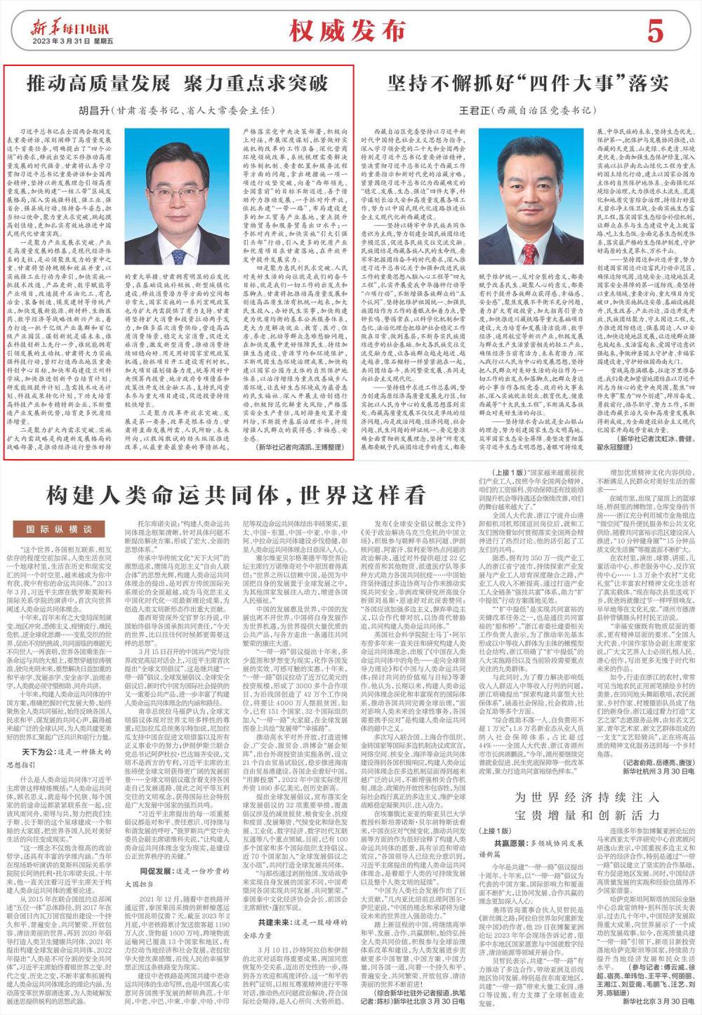 習(xí)近平總書(shū)記在全國(guó)兩會(huì)期間發(fā)表重要講話(huà),深刻闡釋了高質(zhì)量發(fā)展這個(gè)首要任務(wù),明確提出了“四個(gè)必須”的要求,釋放出堅(jiān)定不移推動(dòng)高質(zhì)量發(fā)展的時(shí)代強(qiáng)音。甘肅將認(rèn)真學(xué)習(xí)貫徹習(xí)近平總書(shū)記重要講話(huà)和全國(guó)兩會(huì)精神,堅(jiān)持以新發(fā)展理念引領(lǐng)高質(zhì)量發(fā)展,加快構(gòu)建“一核三帶”區(qū)域發(fā)展格局,深入實(shí)施強(qiáng)科技、強(qiáng)工業(yè)、強(qiáng)省會(huì)、強(qiáng)縣域行動(dòng),保持奮斗姿態(tài),擔(dān)當(dāng)初心使命,聚力重點(diǎn)求突破,跳起摸高創(chuàng)佳績(jī),更加扎實(shí)有效地推進(jìn)中國(guó)式現(xiàn)代化甘肅實(shí)踐。