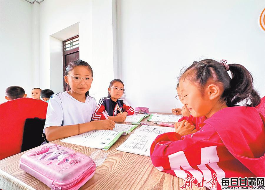 ▲孩子們?cè)诟幻裥麓濉耙焕弦挥住标P(guān)愛服務(wù)中心寫暑假作業(yè)。