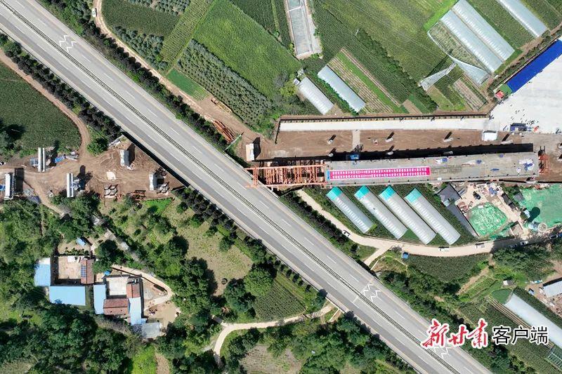 ▲G309線合水(老城)至西峰段跨青蘭高速公路大橋以頂推施工方式加快鋼箱梁架設(shè)進度。新甘肅·甘肅日報通訊員 張賓 攝