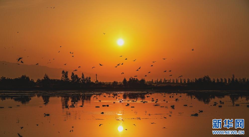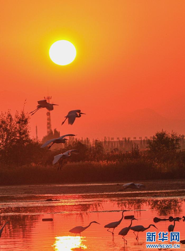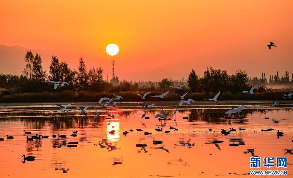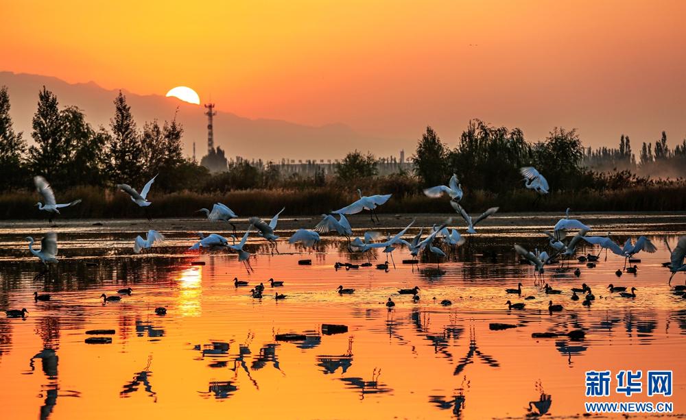 近日,在甘肅省張掖國家濕地公園,成群的白鷺迎著朝陽悠然自得地飛翔、覓食、嬉戲,構(gòu)成了一幅朝陽伴鷺飛的美麗畫卷。新華網(wǎng)發(fā)(陳禮 攝)