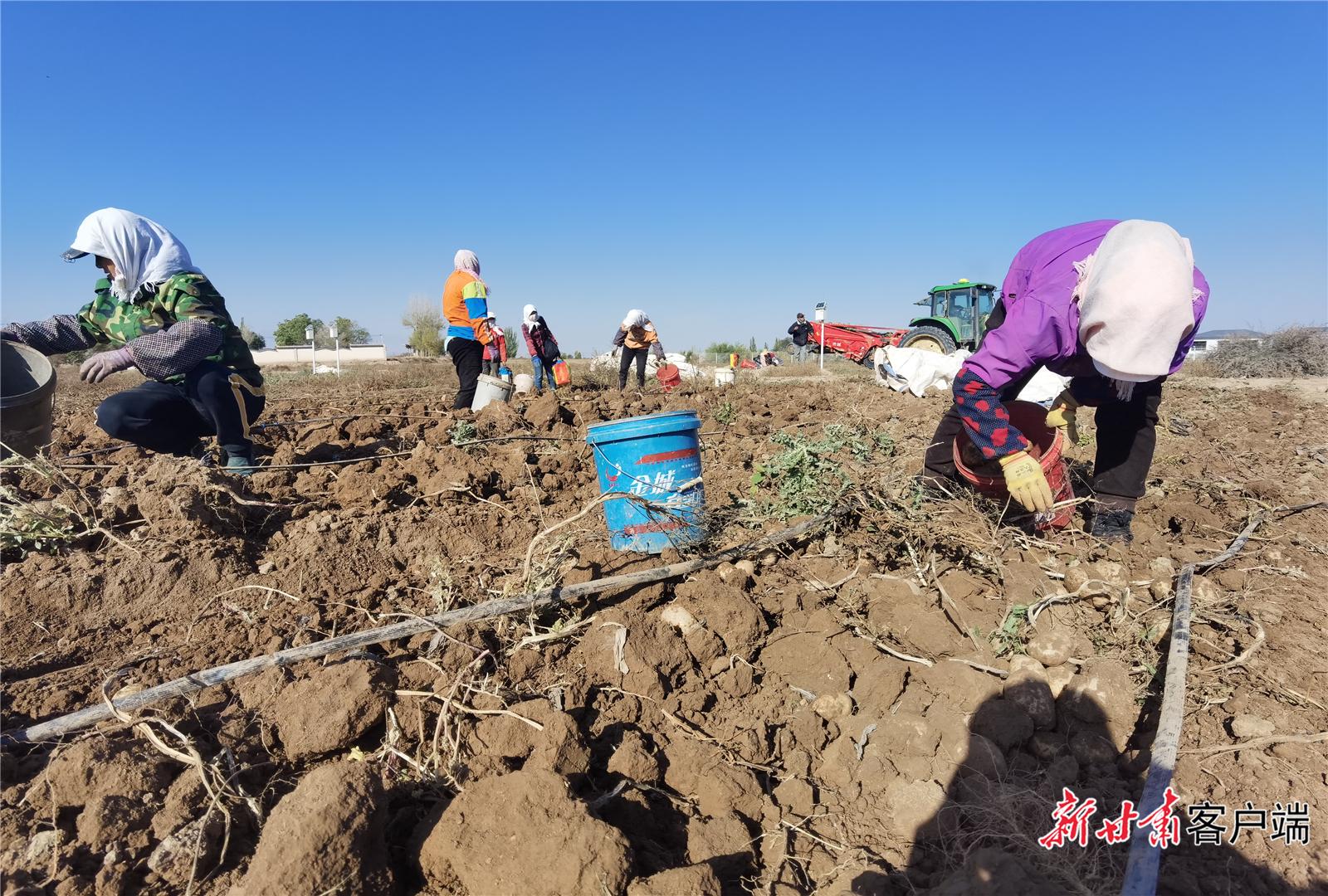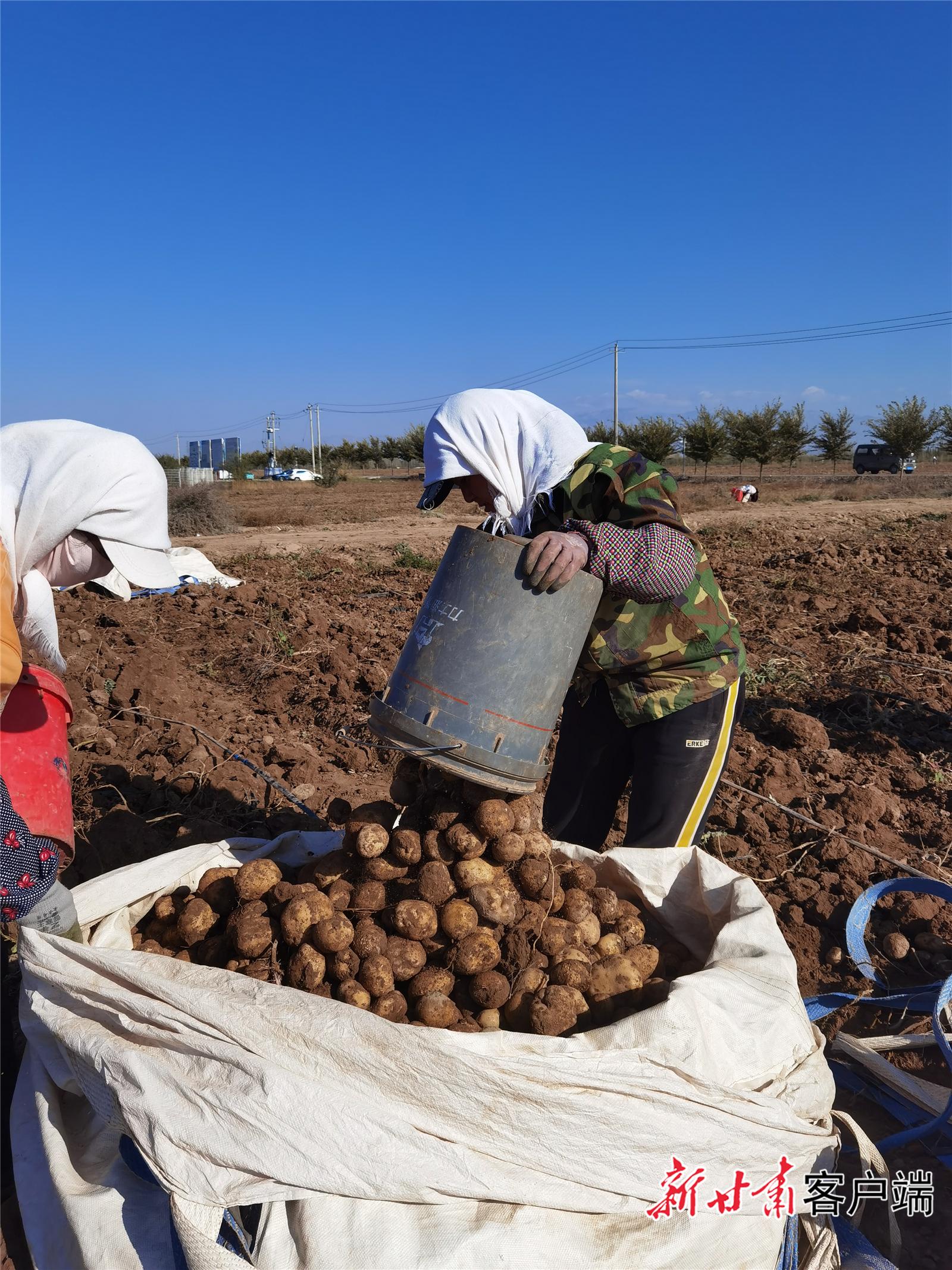 民樂縣高標(biāo)準(zhǔn)農(nóng)田里,馬鈴薯收獲機(jī)在前面翻挖,農(nóng)戶在后面拾揀馬鈴薯。