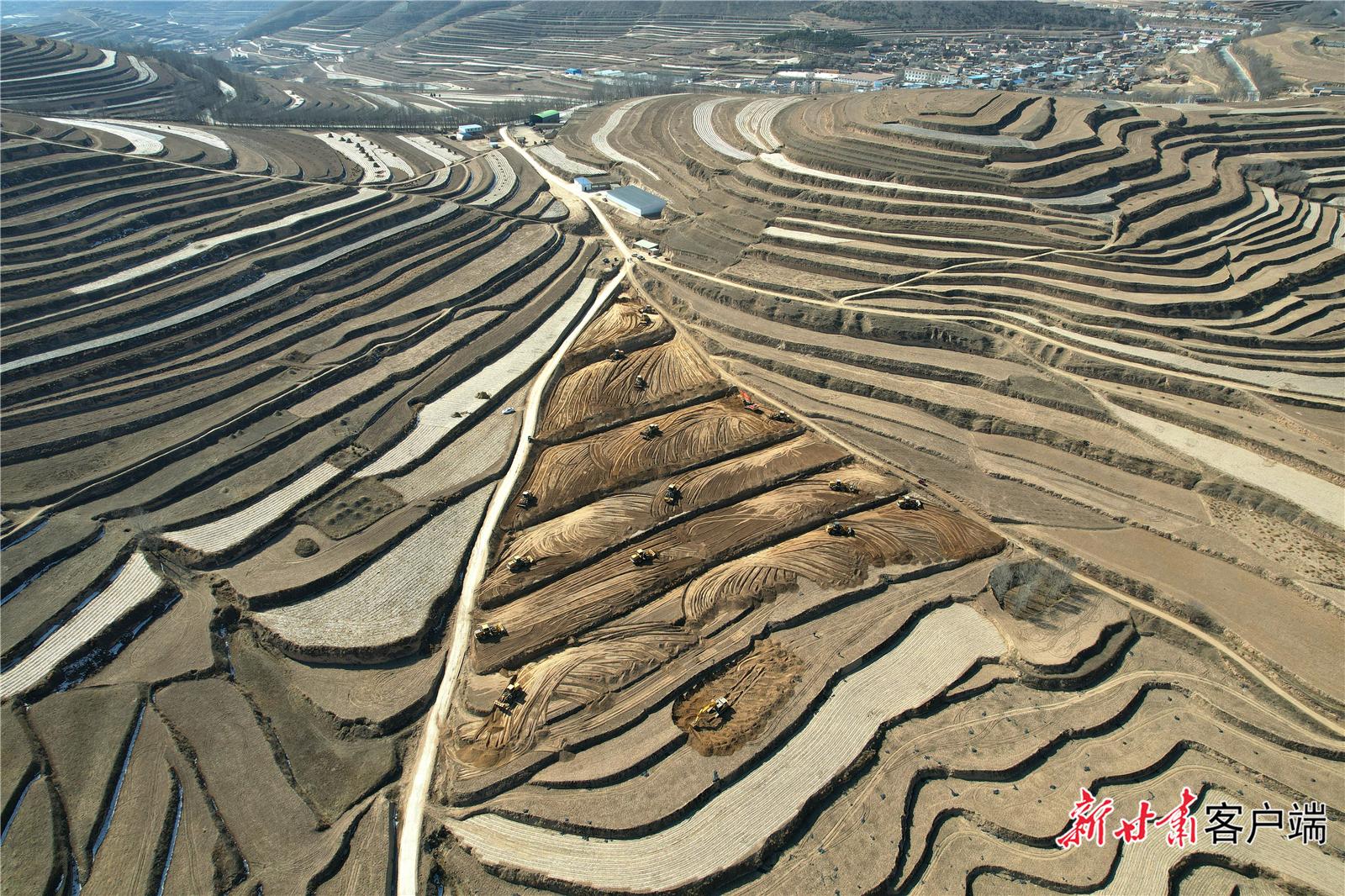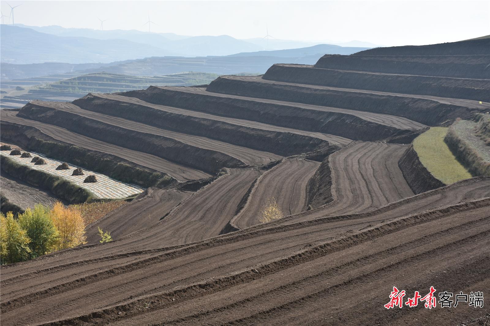 通渭縣高標(biāo)準(zhǔn)農(nóng)田建設(shè),將雜亂的小塊梯田平整成大片臺(tái)地。