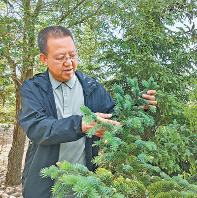 在金華林,陳正斌查看云杉生長情況。