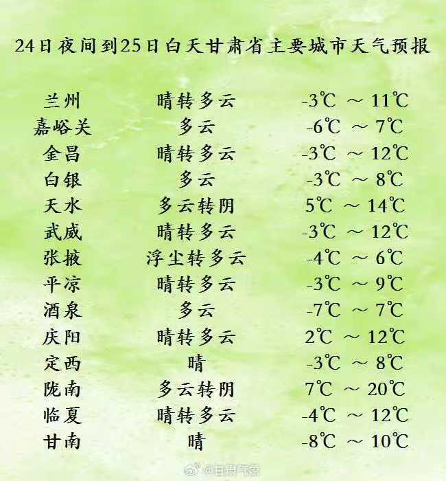 明天夜間到后天白天(2月25日20時—2月26日20時)全省各地晴或多云,其中酒泉、張掖兩市局部地方陰有小雪。