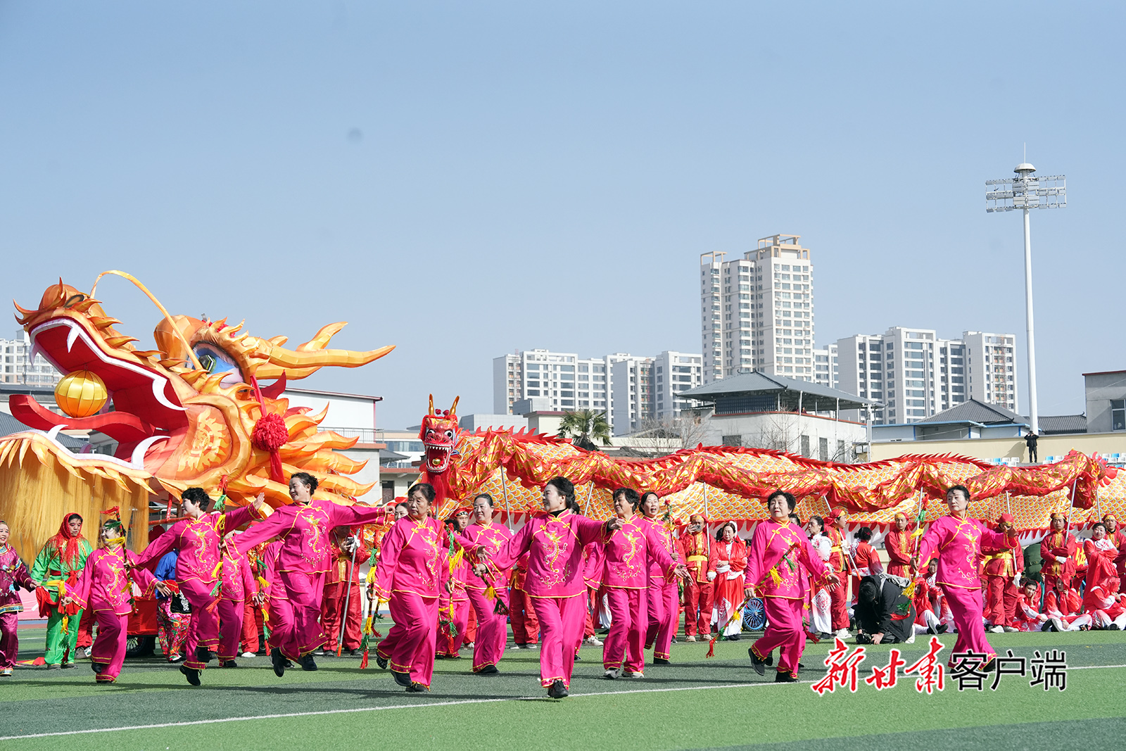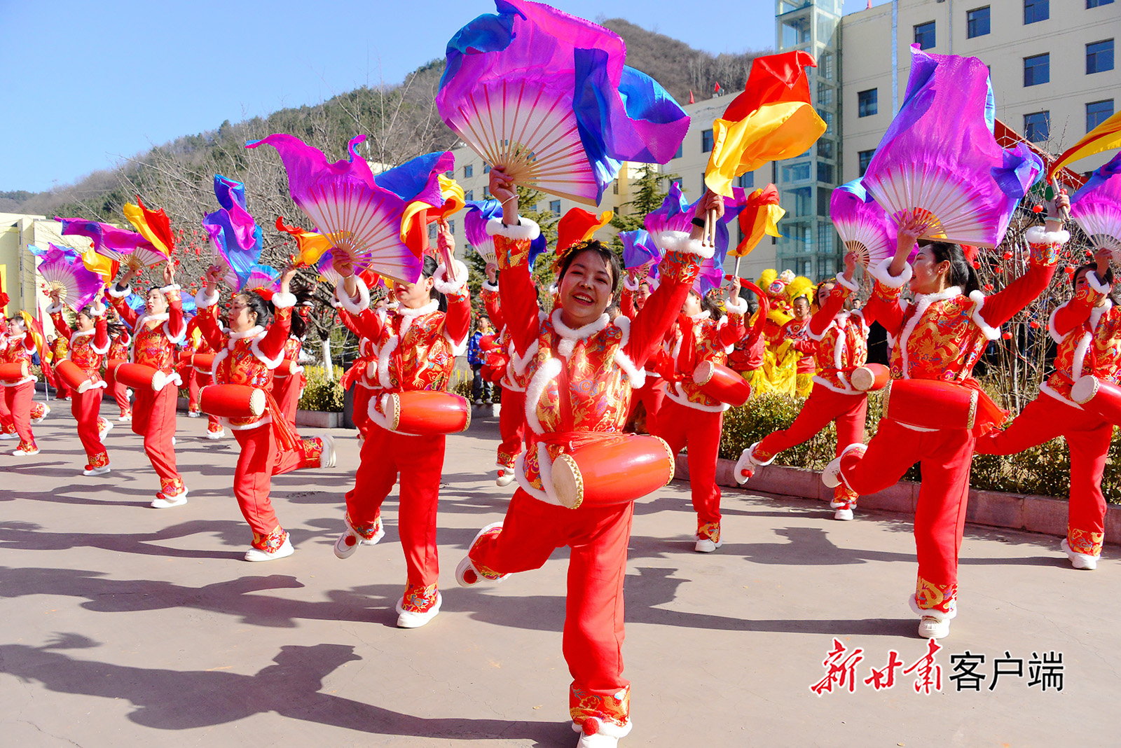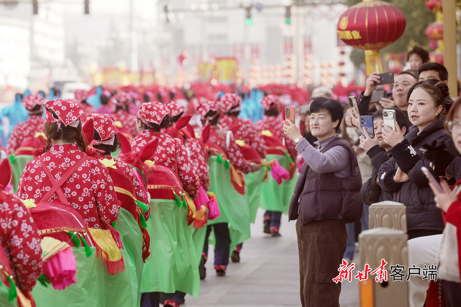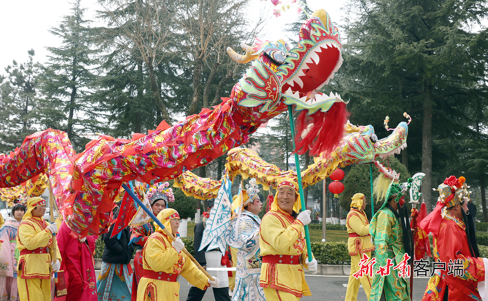 2月24日,慶陽市西峰區(qū)董志鎮(zhèn)莊子洼村、吳莊村社火隊(duì)輪番上陣,與當(dāng)?shù)馗刹柯毠ぜ爸苓吶罕娨黄鸸矐c賀新春。新甘肅·甘肅日?qǐng)?bào)通訊員 盤小美