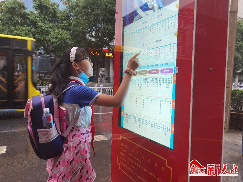 6月24日,一名小學生正在位于秦州區(qū)建設路迎賓館公交站臺上的智能公交站牌前操作查詢。