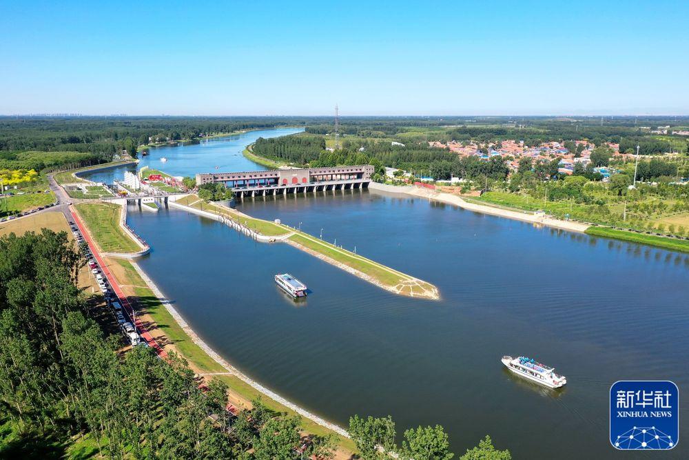 ↑游船駛過(guò)大運(yùn)河京冀交界處楊洼閘(2022年6月24日攝)。新華社記者 彭子洋 攝