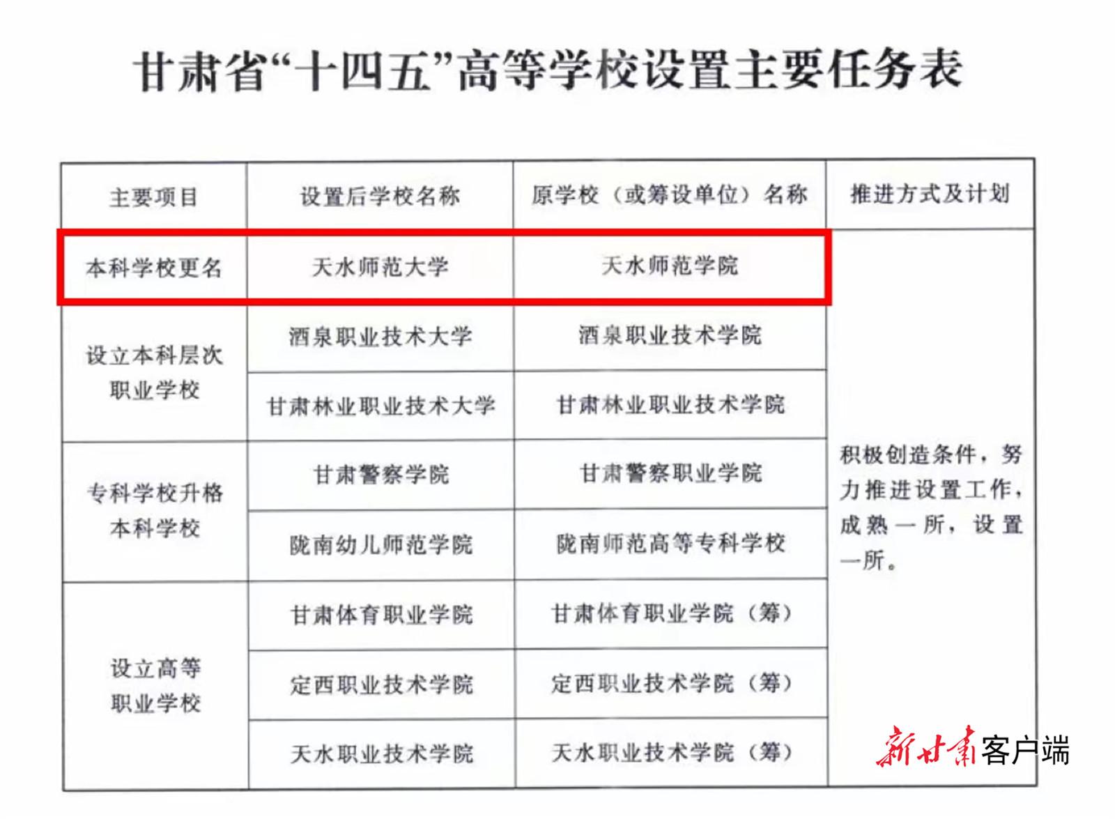 新甘肅客戶端天水訊(新甘肅·甘肅日報記者 白永萍 通訊員 黃亞珠)日前,省政府辦公廳印發(fā)了“十四五”高等學(xué)校設(shè)置規(guī)劃的通知,天水師范學(xué)院更名為天水師范大學(xué),并被列入省“十四五”高等學(xué)校設(shè)置規(guī)劃,成為規(guī)劃中唯一一所本科更名學(xué)校。