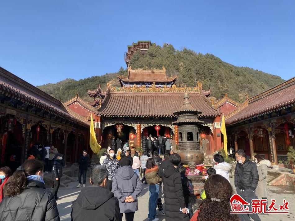 新天水訊【記者甄娜】1月22日,正值大年初一,天空晴朗,位于麥積區(qū)的凈土寺車流攢動(dòng),賓客如云。登上較高一處大殿,轉(zhuǎn)身放目望去,山谷起伏深邃,廟宇層出不窮,猶如一幅意境高明的山水畫軸,不時(shí)傳來的鐘聲,讓喧鬧繁雜的人們感受到一絲絲寧靜。甘露池已經(jīng)結(jié)冰,不過,白色的冰凍池面“開封”的一處,各色魚兒暢游其中,吸引了許多游人跓足欣賞。