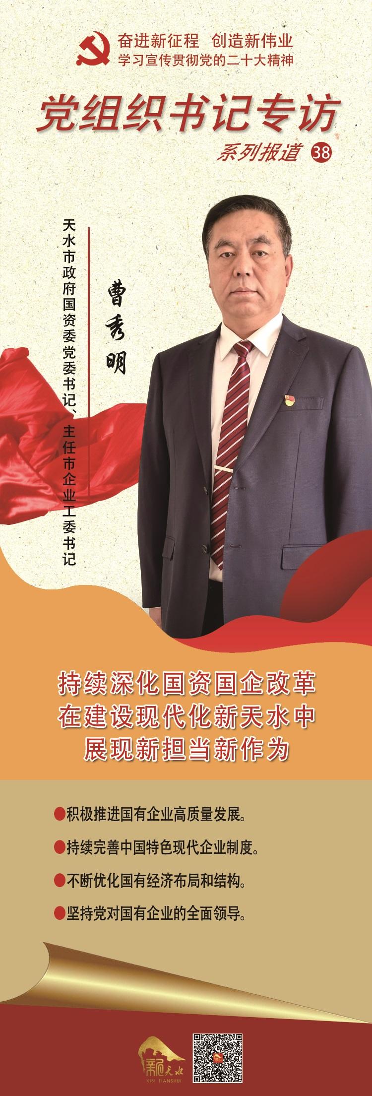 “黨的二十大報告指出,要深化國資國企改革,加快國有經(jīng)濟布局優(yōu)化和結(jié)構(gòu)調(diào)整,推動國有資本和國有企業(yè)做強做優(yōu)做大,提升企業(yè)核心競爭力,這為新時代國資國企改革發(fā)展指明了方向。我們將把學(xué)習(xí)宣傳貫徹黨的二十大精神作為當(dāng)前和今后一個時期的首要政治任務(wù),緊密結(jié)合省第十四次黨代會和市第八次黨代會精神,在補短板、強弱項、固底板、揚優(yōu)勢上下功夫,努力謀劃和推動國資國企發(fā)展改革監(jiān)管和黨的建設(shè)各項工作取得新成效,在天水推進中國式現(xiàn)代化中展現(xiàn)國資國企新?lián)?dāng)新作為?!比涨?,市政府國資委黨委書記、主任,市企業(yè)工委書記曹秀明在接受記者采訪時說。