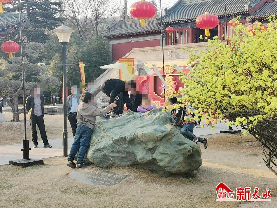 2月5日,在伏羲廟內(nèi),有些小孩攀爬雕塑甚至坐在雕塑上玩耍,既不雅觀也不安全。在此提醒廣大市民要加強(qiáng)對(duì)孩子的教育,在景點(diǎn)游玩時(shí),要引導(dǎo)孩子勿攀爬雕塑,遵守公德,注意安全。