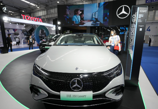 2022年8月26日,參觀者在2022年世界新能源汽車大會北京展區(qū)參觀展出的奔馳新能源汽車。新華社記者 鞠煥宗 攝