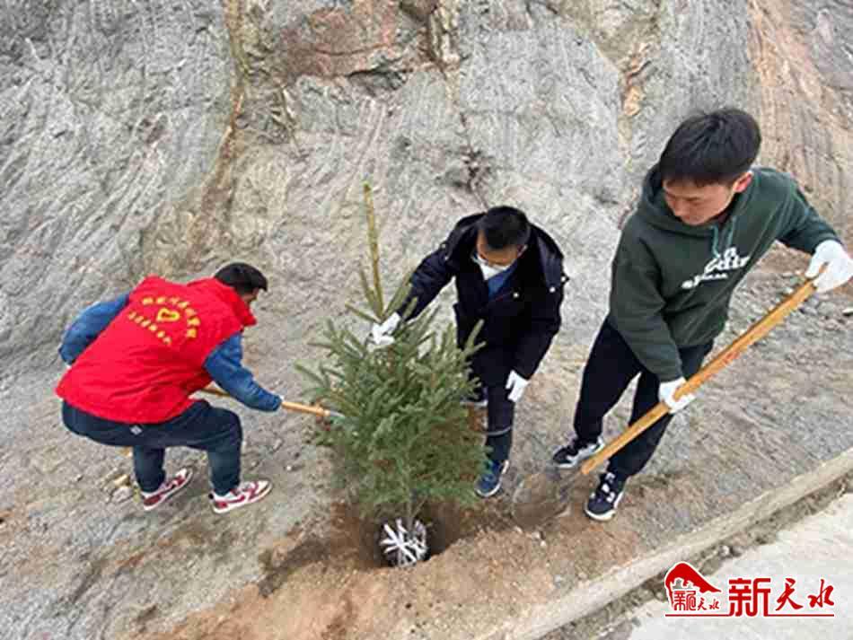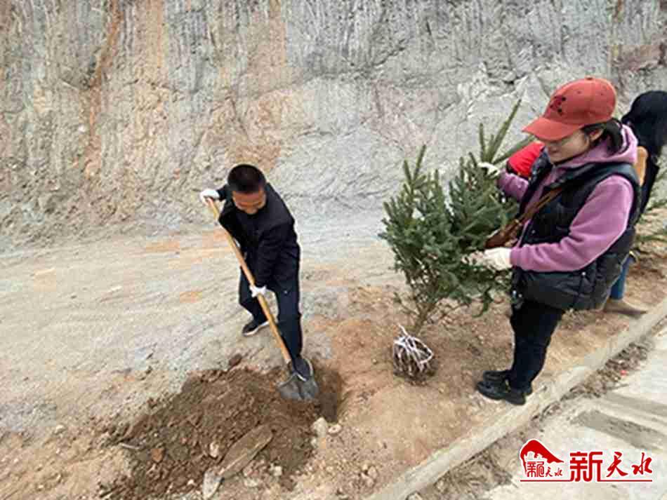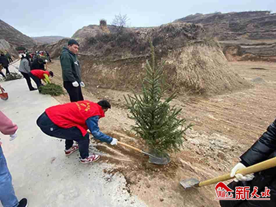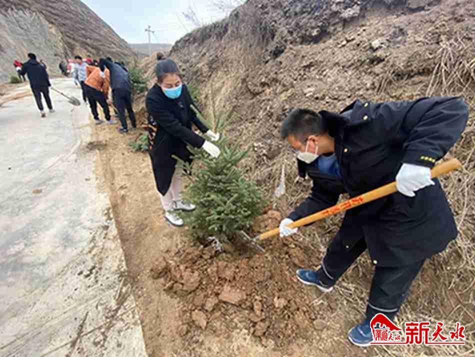 新天水迅 陽(yáng)春三月,生機(jī)勃勃,綠染大地。3月20日至22日,在張家川縣劉堡鎮(zhèn)鄭溝村至蘆科村的公路沿線、溝渠路邊,隨處可見(jiàn)挖穴栽樹(shù)、澆水封土的身影。新栽的樹(shù)苗新芽萌動(dòng),路旁的綠樹(shù)涂紅抹白,成為美麗鄉(xiāng)村一道靚麗的風(fēng)景。