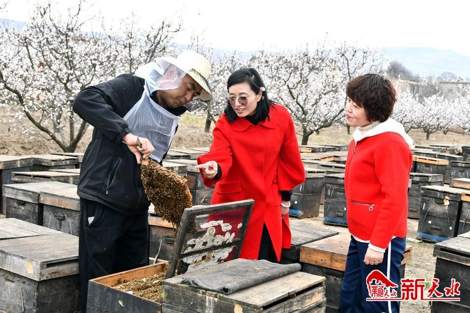 新天水訊【特約通訊員竇耀輝】“一朵花、一棵樹(shù),一座房子、一條路,一座山、一條河,一只小船、一個(gè)我……”。3月26日,在麥積區(qū)新陽(yáng)鎮(zhèn)愛(ài)國(guó)養(yǎng)蜂農(nóng)民專(zhuān)業(yè)合作社養(yǎng)蜂基地,兩位身著紅色衣服的女主播,看到剛剛從四川綿陽(yáng)轉(zhuǎn)場(chǎng)過(guò)來(lái)的180箱蜜蜂在這里安營(yíng)扎寨,喜悅之情溢于言表,并通過(guò)網(wǎng)絡(luò)平臺(tái)唱起了《紅山果》,與漫山遍野競(jìng)相綻放的粉紅色杏花同框,并在養(yǎng)蜂主人的指導(dǎo)下零距離和蜜蜂親密接觸,感受萬(wàn)物皆有靈性的神奇奧妙,吸引眾多游客紛至沓來(lái)。