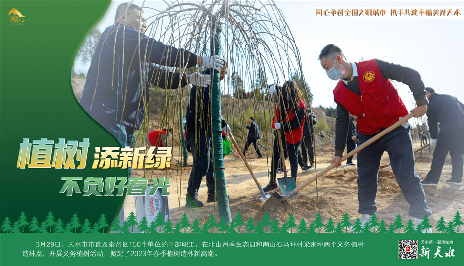 陽春三月,春風(fēng)吐綠,草木初蔭,正是植樹綠化好時(shí)節(jié)。3月29日,天水市市直及秦州區(qū)156個(gè)單位的干部職工,在北山月季生態(tài)園和南山石馬坪村梁家坪兩個(gè)義務(wù)植樹造林點(diǎn),開展義務(wù)植樹活動(dòng),掀起了2023年春季植樹造林新高潮。
