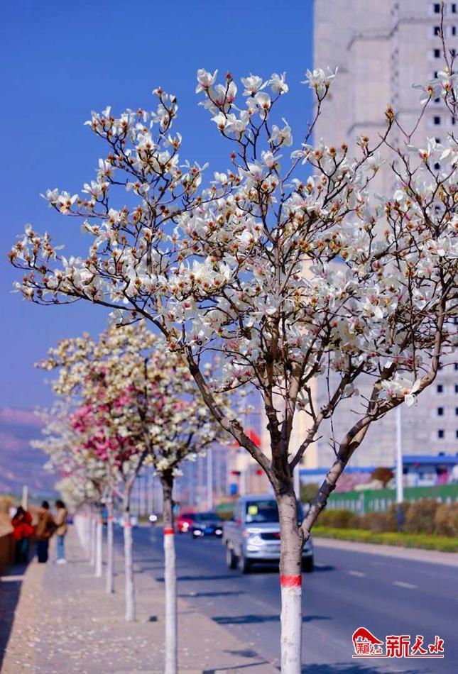 春風(fēng)拂面,玉蘭花開。近日,武山縣濱河路洛門段的白玉蘭悄然開放,素裝淡裹,晶瑩剔透,美而不驕,純而不烈,清新淡雅,白如脂玉,淡紫馨香,吸引路過的行人停下腳步,用手機(jī)拍攝記錄這美的瞬間。