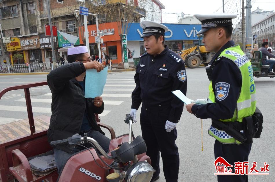 “你好,安全頭盔怎么沒(méi)有戴?交通安全記心間,安全無(wú)小事,以后騎車一定要戴好頭盔?!?月9日上午,在張家川回族自治縣城區(qū)解放路十字,張家川縣公安局交警大隊(duì)城區(qū)中隊(duì)副中隊(duì)長(zhǎng)汪曉文正向一名騎電動(dòng)車的駕駛?cè)似占敖煌ò踩R(shí)。