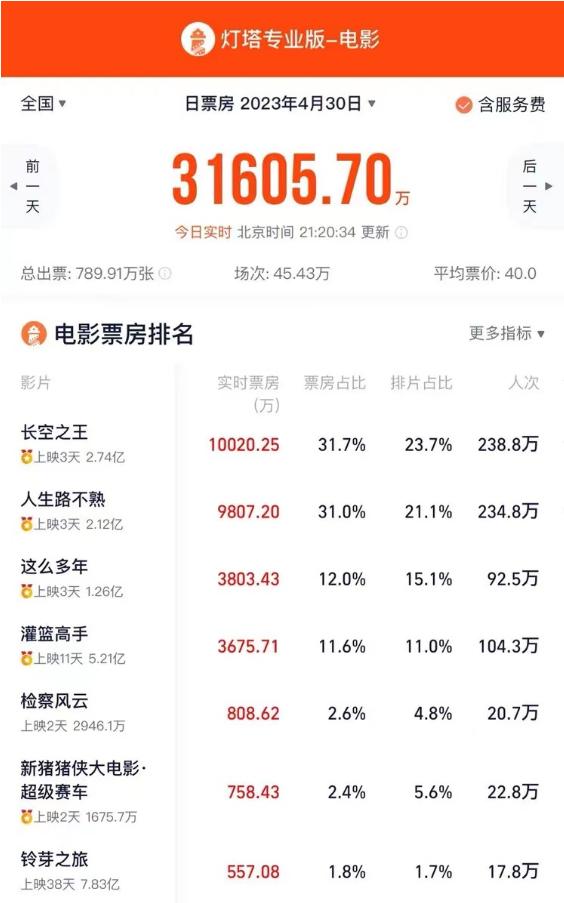 據(jù)燈塔專業(yè)版實(shí)時(shí)數(shù)據(jù),截至4月30日21時(shí)20分,“五一檔”次日(4月30日)大盤票房突破3.16億元,超過“五一檔”首日票房3.14億元,其中《長(zhǎng)空之王》《人生路不熟》《灌籃高手》《鈴芽之旅》等多部影片單日票房均創(chuàng)新高。