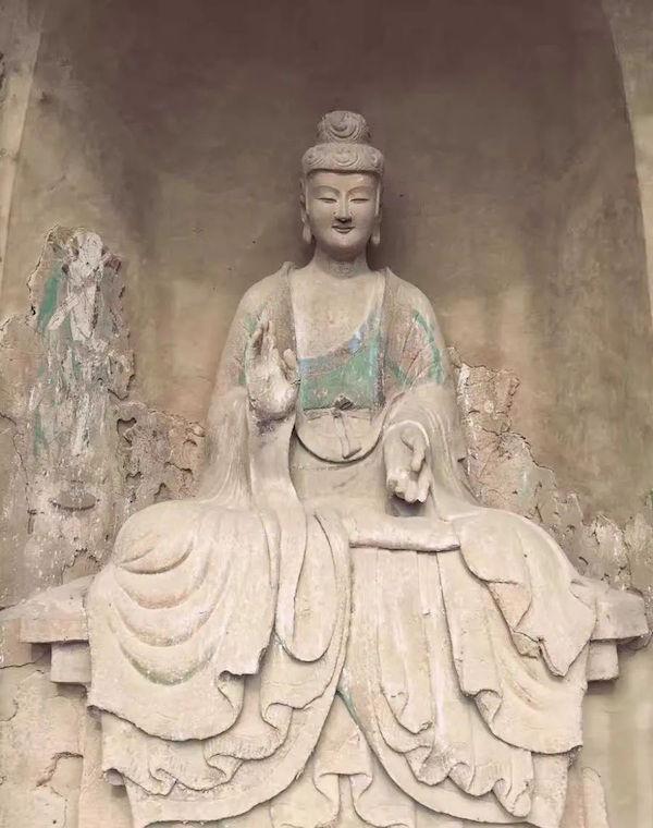 第23窟正壁主佛的微笑 這尊主佛,據(jù)說是北魏晚期特征比較突出的佛像,就憑所具有的秀骨清俊、面容清瘦這一點(diǎn)就完全可以證明。相較上述幾窟塑像,這是較不完整的一尊,很可能就是在唐開元二十二年(公元734年)那次大地震中,致雙手殘損無存,應(yīng)該說也是毀壞較為嚴(yán)重的一尊,但當(dāng)我經(jīng)過此窟,透過柵欄往里一看的那一瞬間,似乎一眼就發(fā)現(xiàn)他那挺立端坐的身軀在微微顫動(dòng),連下垂的袈裟也落下些許灰塵。在人神相互對(duì)視的不經(jīng)意間,我發(fā)現(xiàn)他那朗疏的眉目之間流露出了一種神秘、深邃且難以提摸的微笑,在細(xì)長的眼角的襯托下,有如清風(fēng),亦似清泉。這神秘、深邃的微笑,到底是不是他已經(jīng)悟透了人間的奧秘、領(lǐng)略了人生的真諦的一種表述,亦或是心靈已經(jīng)抵達(dá)了彼岸的由衷的睿智表現(xiàn)?我不知道。但有一點(diǎn)似乎是肯定的,他要告訴現(xiàn)實(shí)中的人一點(diǎn)什么內(nèi)容……