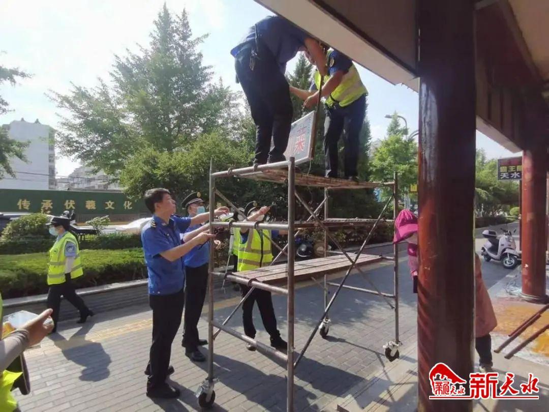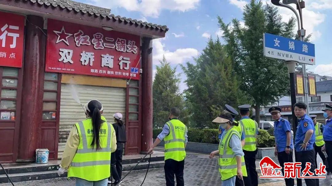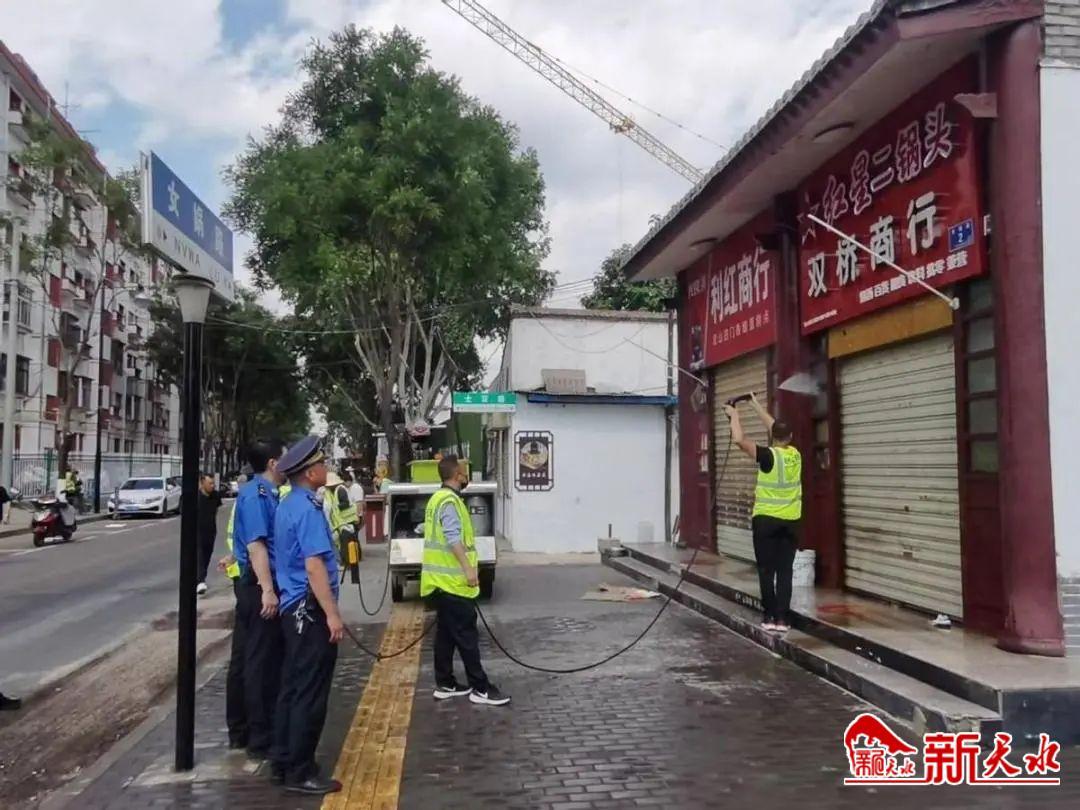 整治行動中,執(zhí)法人員嚴格按照“全面治理、長效監(jiān)管”的原則,對轄區(qū)主次干道、背街小巷及伏羲廟周邊的店外經營、占道經營、亂立廣告牌、亂吊亂掛、亂停亂放等影響市容市貌的行為進行全面治理;中隊還聯合環(huán)衛(wèi)部門對雙橋路所有門店門頭、卷閘門、門窗等進行集中沖洗,并督促各家商戶對門店外形象進行整改,對破損門頭、廣告牌及時進行拆卸。