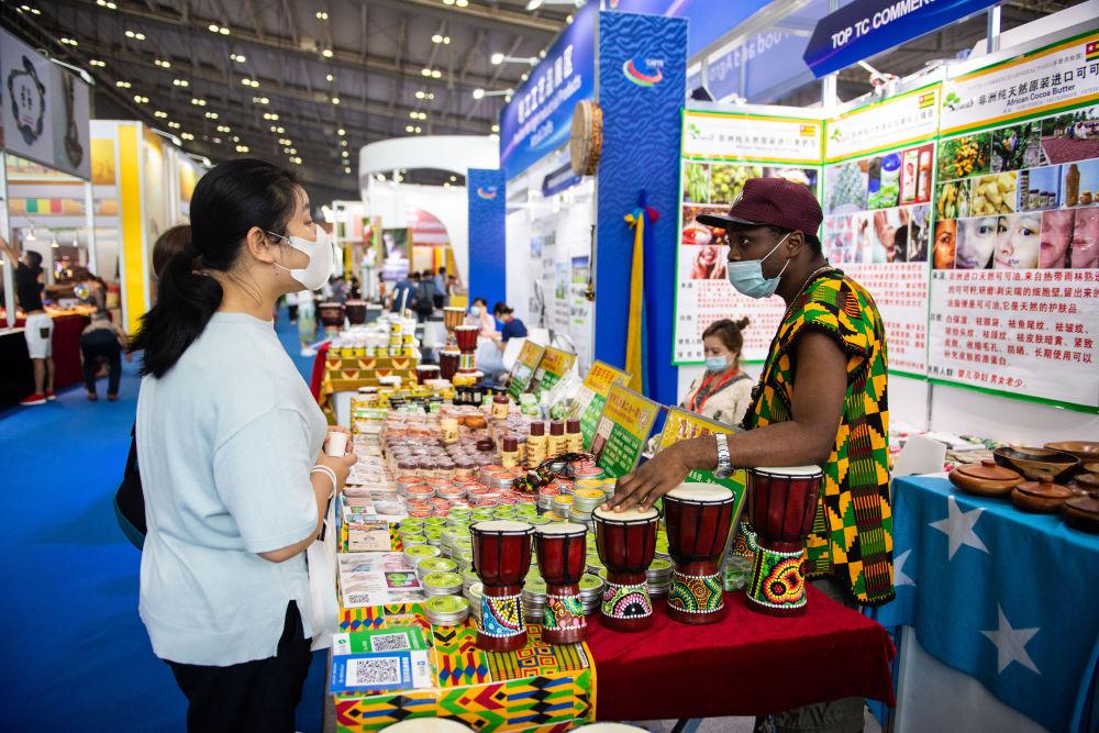 在長(zhǎng)沙國(guó)際會(huì)展中心舉辦的第二屆中國(guó)-非洲經(jīng)貿(mào)博覽會(huì)上,觀眾(左)在選購(gòu)非洲護(hù)膚品(2021年9月28日攝)。新華社記者陳思汗攝