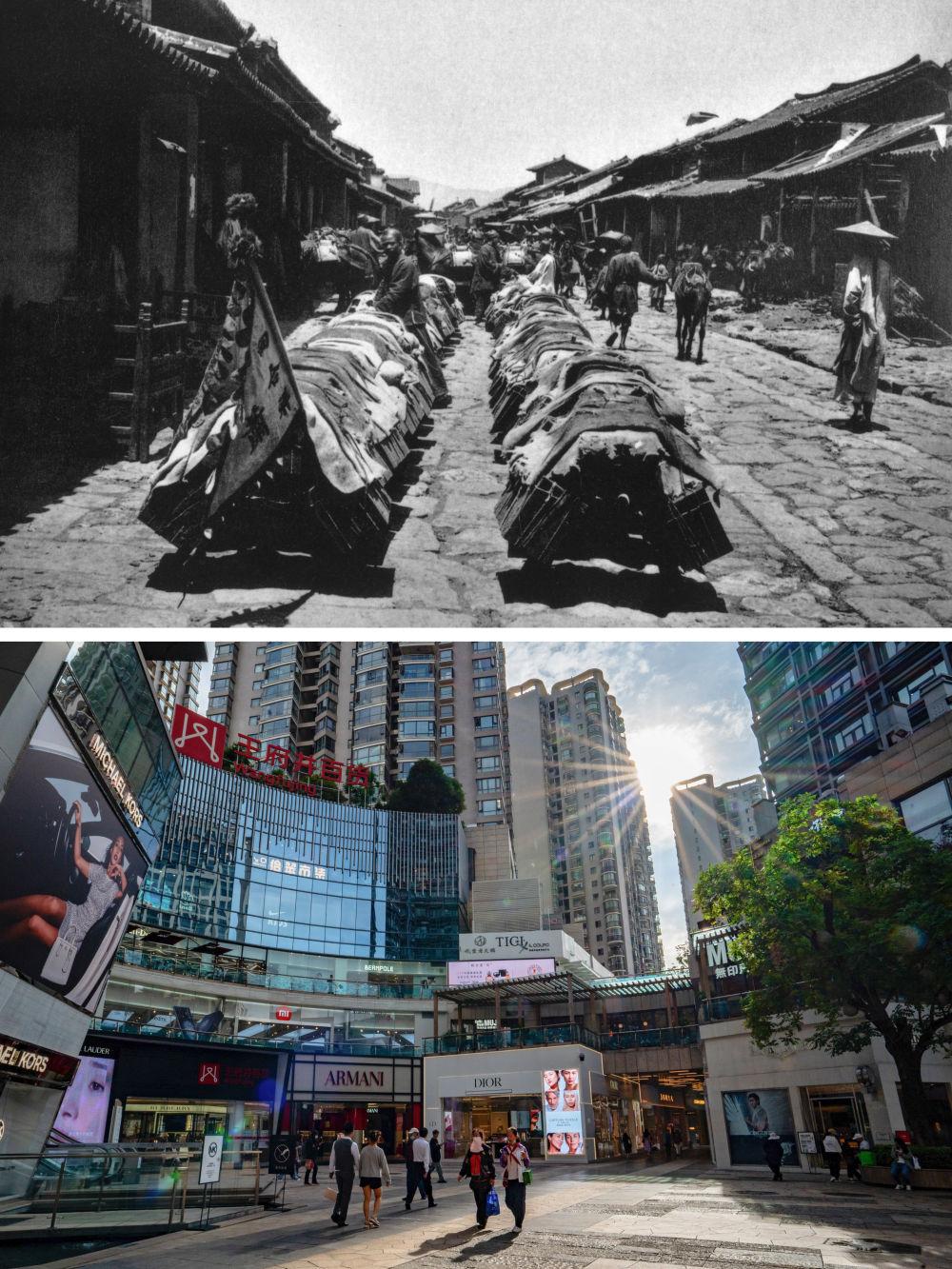 上圖為:清末,法國駐華官員方蘇雅拍攝的鏢局押運(yùn)馬幫在順城街的照片(資料照片由殷曉俊提供)。下圖為:6月15日拍攝的昆明順城街購物中心景象。新華社記者江文耀 攝