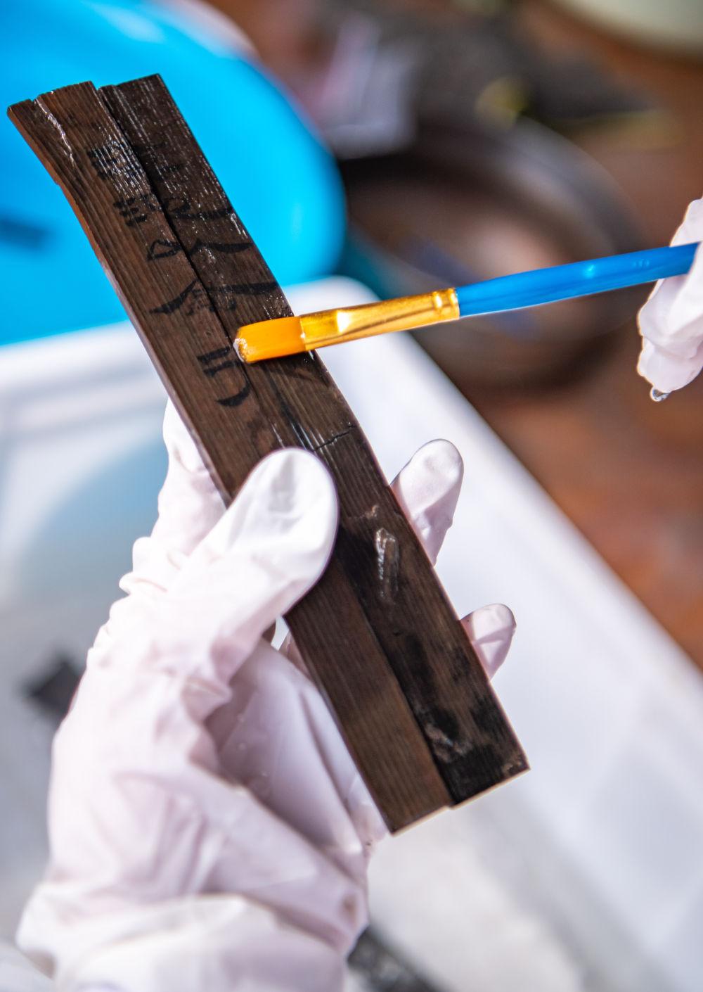 考古工作者在清理云南河泊所遺址出土的簡牘(2022年9月21日攝)。新華社記者江文耀 攝