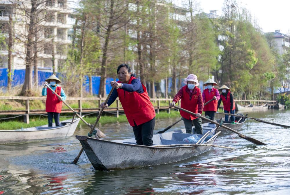 3月20日,李云麗(左二)帶領(lǐng)巾幗打撈隊(duì)隊(duì)員劃船準(zhǔn)備到滇池草海開展打撈工作。新華社記者陳欣波 攝
