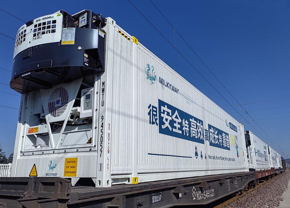 4月19日,裝載著來自泰國等地?zé)釒睦滏溂b箱到達(dá)昆明東站。新華社發(fā)(秦文璐 攝)