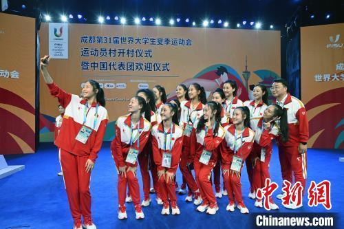 7月22日,成都第31屆世界大學(xué)生夏季運(yùn)動會運(yùn)動員村正式開村,并為首支入住的代表團(tuán)——中國大學(xué)生體育代表團(tuán)舉行了歡迎儀式。圖為成都大運(yùn)會中國大學(xué)生藝術(shù)體操隊隊員在歡迎儀式現(xiàn)場拍照留念。 中新社記者 安源 攝