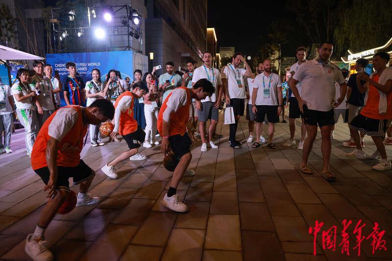 7月29日,四川成都,大運(yùn)村內(nèi),即興的籃球表演吸引了大家的目光。中青報(bào)·中青網(wǎng)記者 曲俊燕/攝