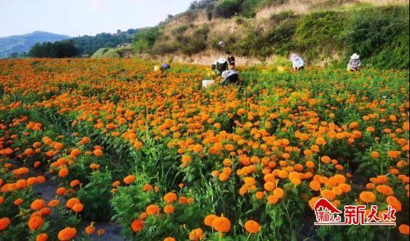 今年,上袁村采取“黨支部+合作社+基地+農(nóng)戶”的模式,充分發(fā)揮鎮(zhèn)村黨組織統(tǒng)籌資源優(yōu)勢,瞄準市場需求,因地制宜,由村股份經(jīng)濟合作社牽頭,結(jié)合撂荒地整治承包村里閑置土地,在西山一組種植萬壽菊70余畝。萬壽菊花期長達4個月,可采摘到10月,最少能采摘四茬,第一茬采收已接近尾聲,四茬采摘畝產(chǎn)量預(yù)計達到3000斤,經(jīng)濟效益明顯。