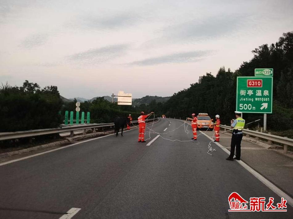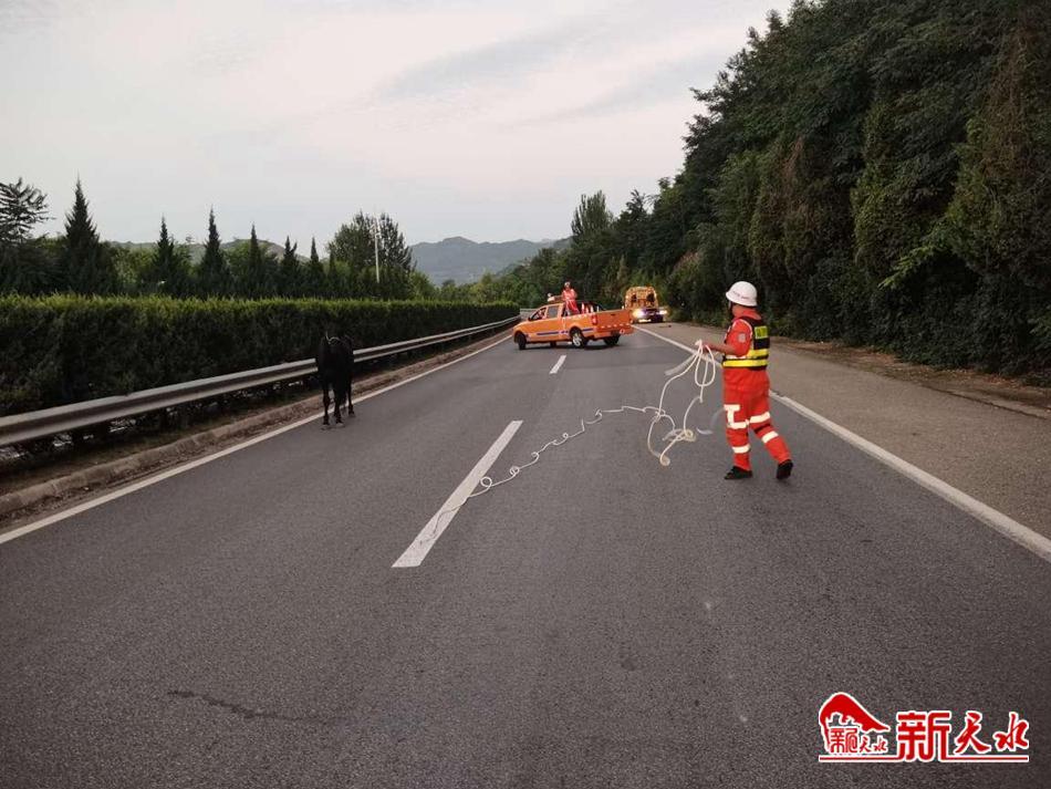 新天水訊 8月20日下午5時31分,天水清障救援二大隊接到寶天收費所監(jiān)控分中心來電,稱寶天高速西安方向K1353處,一匹黑馬在超車道內(nèi)走動,存在行車安全隱患。接到警情后,該大隊立即組織救援力量,攜帶防爆叉、救援繩趕赴現(xiàn)場。