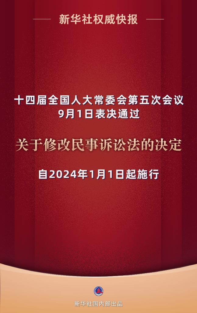 9月1日,十四屆全國人大常委會第五次會議表決通過關(guān)于修改民事訴訟法的決定,自2024年1月1日起施行。