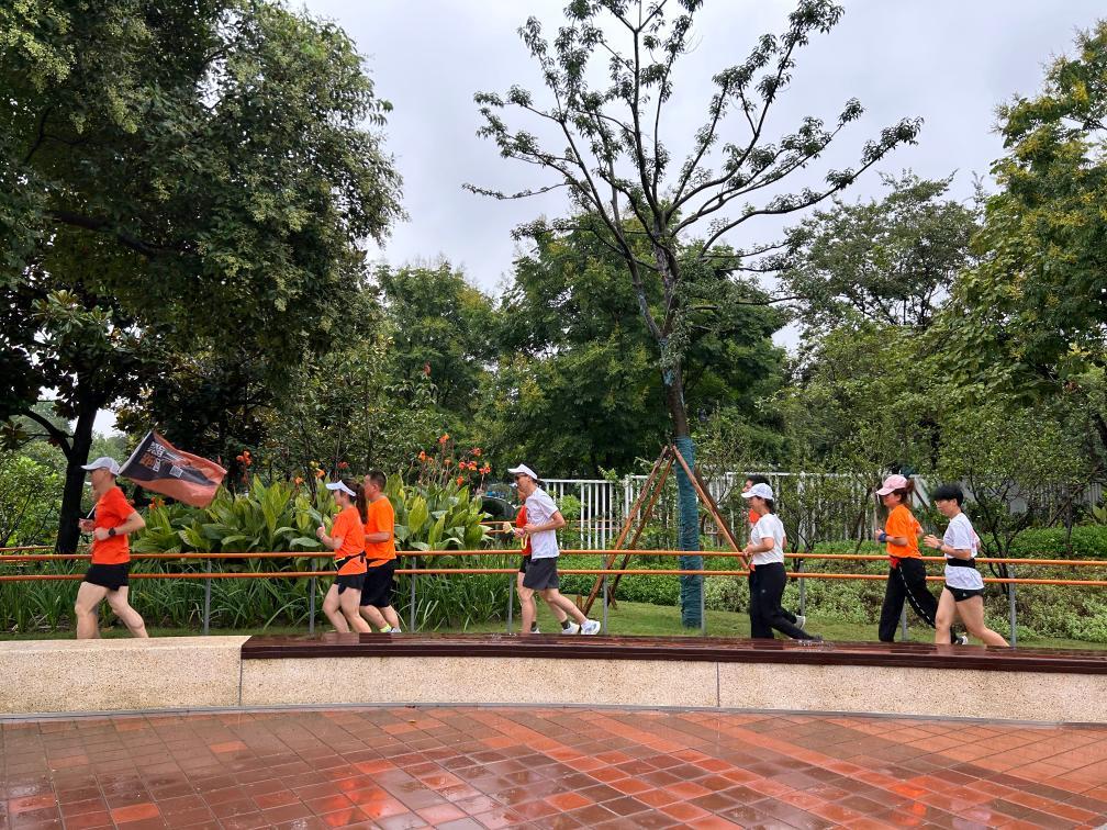 在南京玄武湖的無(wú)障礙花園內(nèi),由盲人、聾啞人等組成的跑團(tuán)在志愿者陪跑員的帶領(lǐng)下跑步鍛煉。(唐玉佳攝)