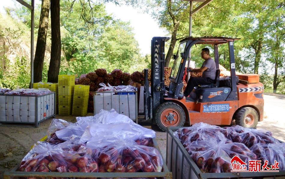 記者在今年5月新建成的馬周村果品交易市場(chǎng)看到,果農(nóng)將一車車蘋果運(yùn)輸?shù)皆撌袌?chǎng),前來收購蘋果的客商忙碌著過秤裝車蘋果,一派紅火的交易場(chǎng)景。