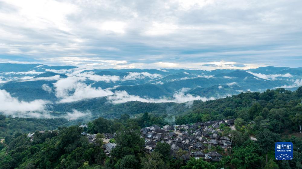 被山林與茶園環(huán)繞的景邁山翁基古寨一景(無人機(jī)照片,9月17日攝)。新華社記者 胡超 攝