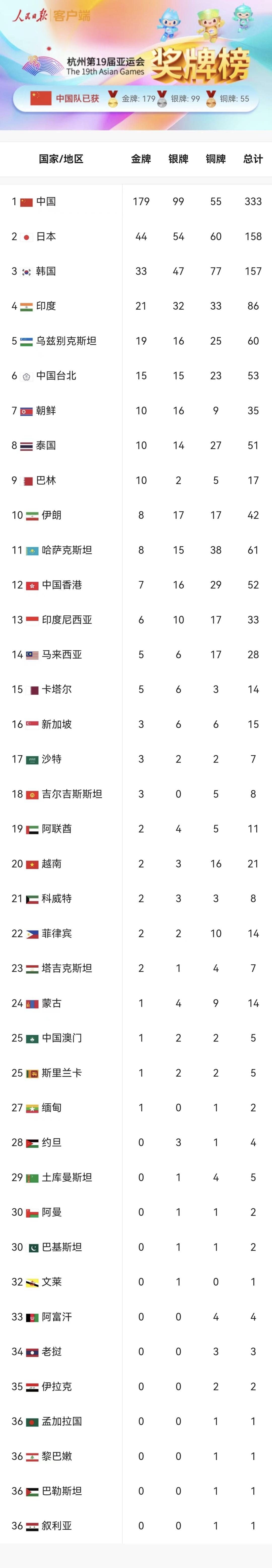 中國隊(duì)已獲得179金99銀55銅